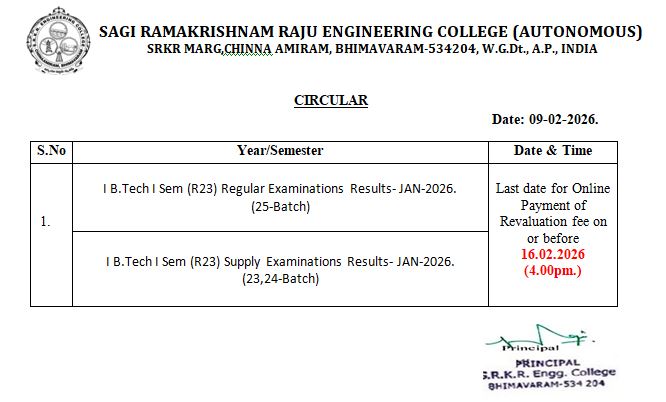 5    23-01-2026  Last date for Online payment of Revaluation fee-R19-(4-2 & 4-1 & 2-2 ) & R17-(4-2 & 4-1 & 2-2 ) R20-(2-2 ) & R20-( 4-1 Honors & Minors-Regular) & R23-(2-2 ) Supply Examinations-NOV/DEC-2025 on or before 27/01/2026 (04.00PM)
